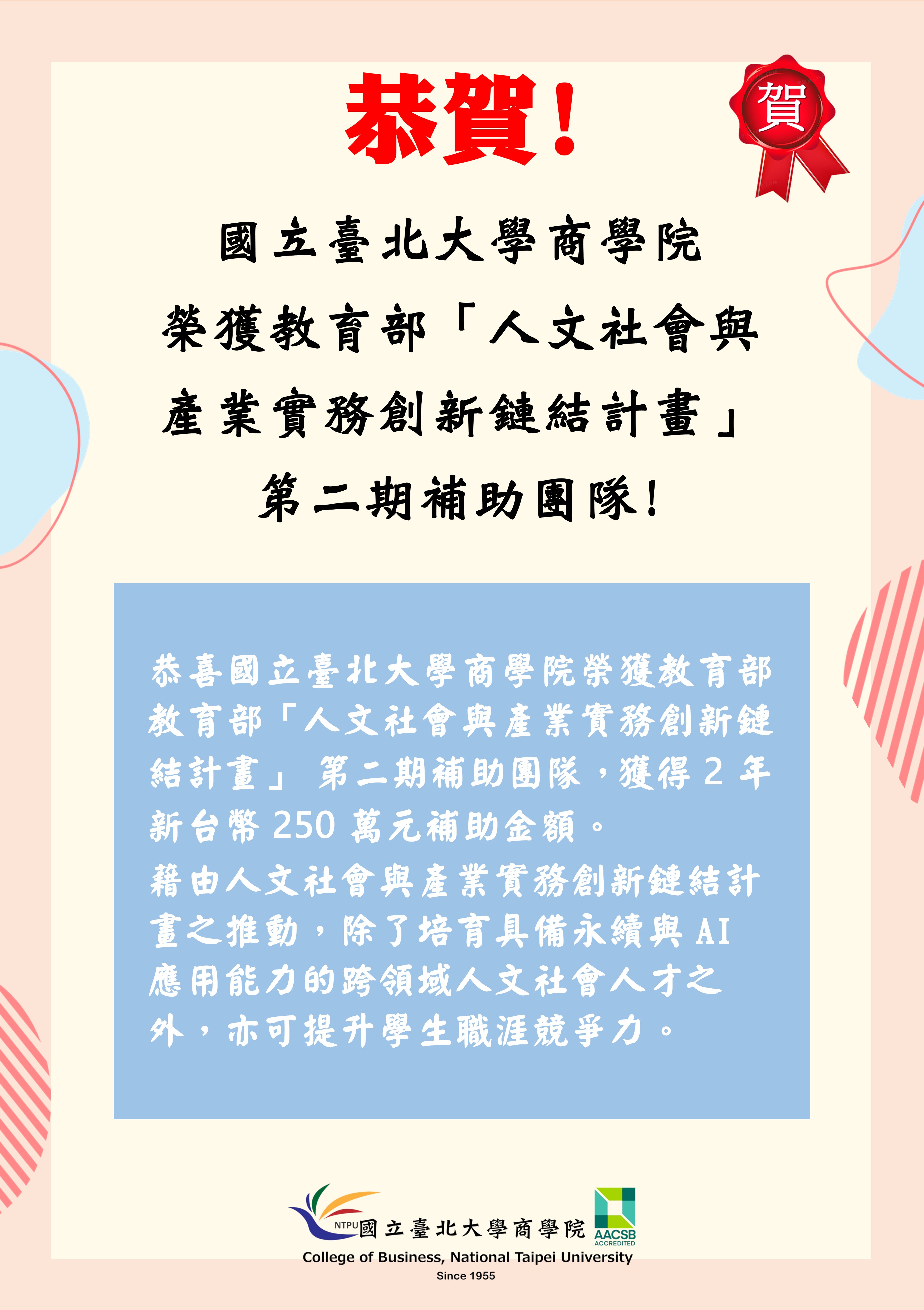 [恭賀] 本院榮獲教育部「人文社會與產業實務創新鏈結計畫」 第二期補助..