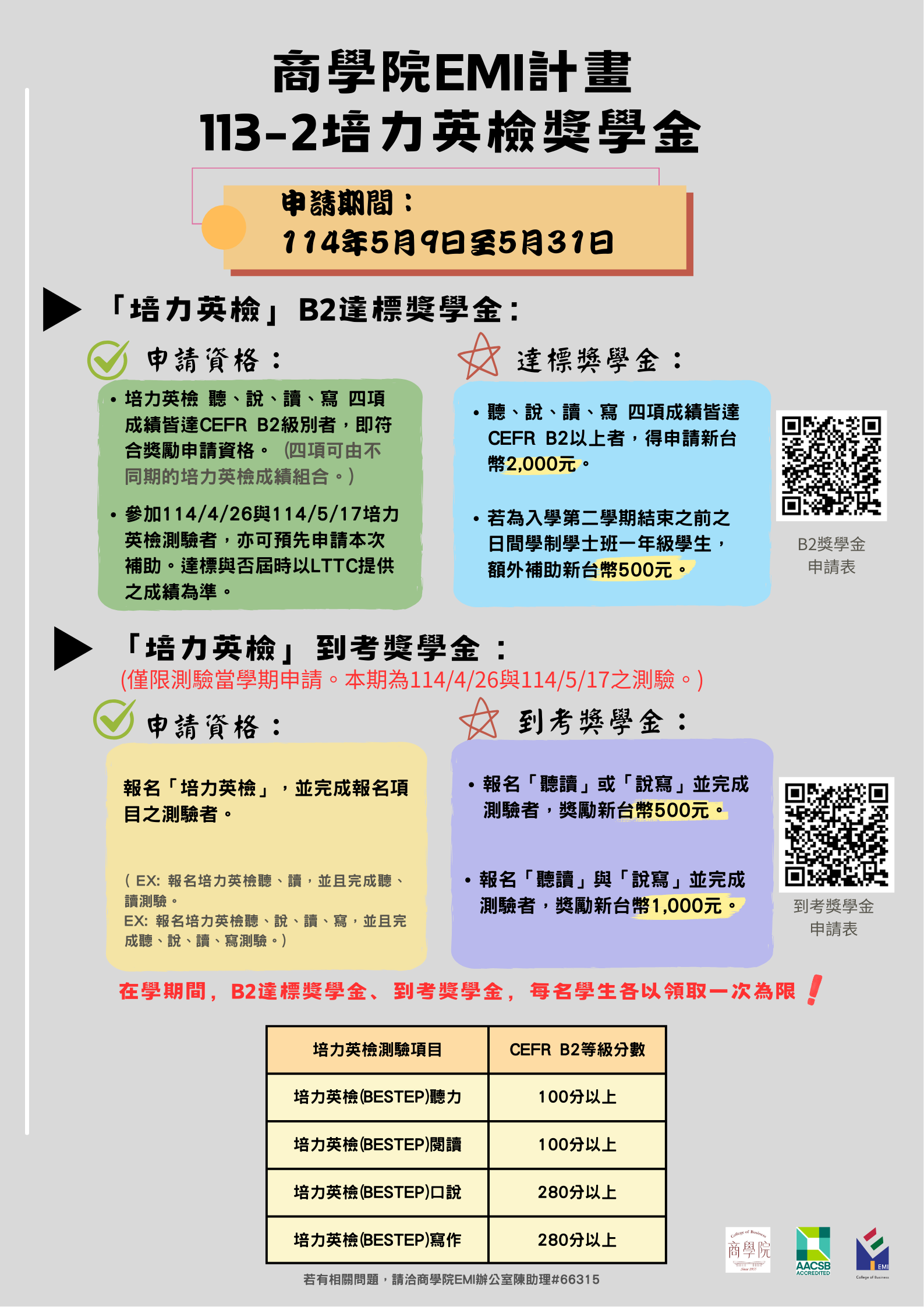 【公告】113-2學年度EMI計畫學生英檢獎學金,開放申請至5月31日!..