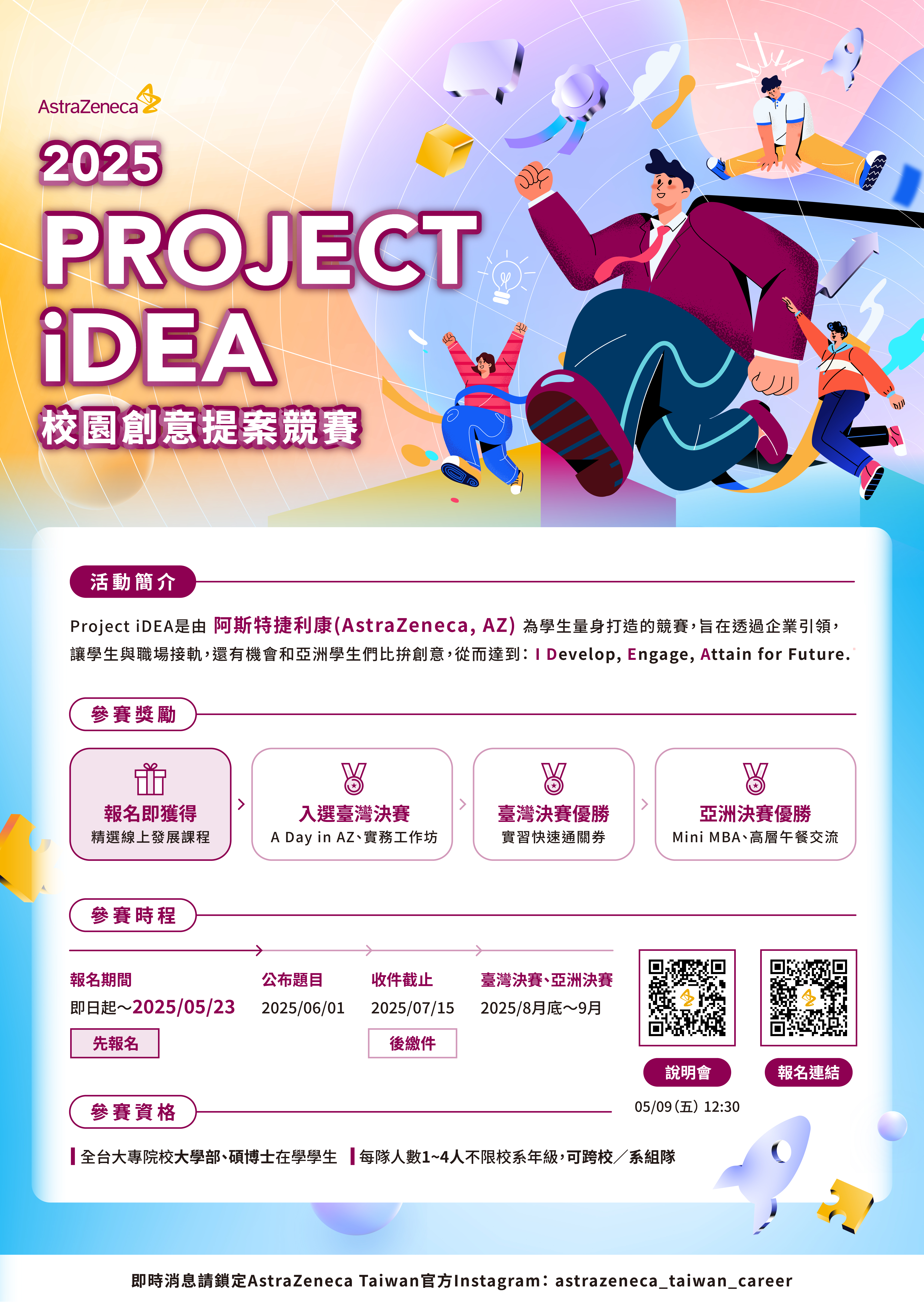 Project iDEA由全球頂尖藥廠 AstraZeneca(AZ)為學生量身打造的創意提案競賽,邀請來自不同科系的你發揮創意、激盪點子,深入了解醫藥產業,拓展跨域思維。