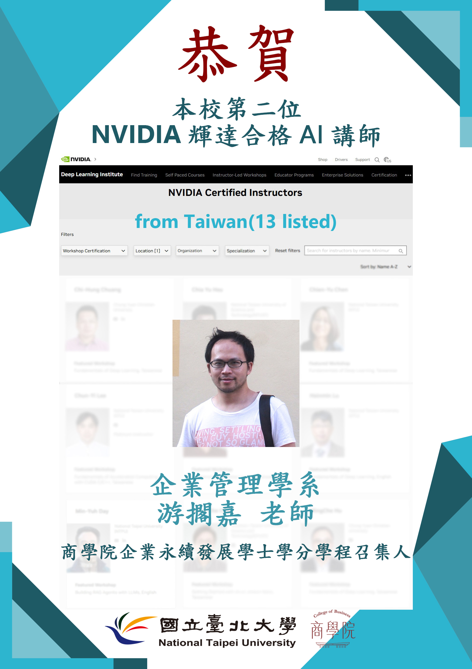女子足球 企管系游擱嘉老師,近日榮獲輝達(NVIDIA)合格講師資格,成為本校第二位獲得此殊榮的教職員。