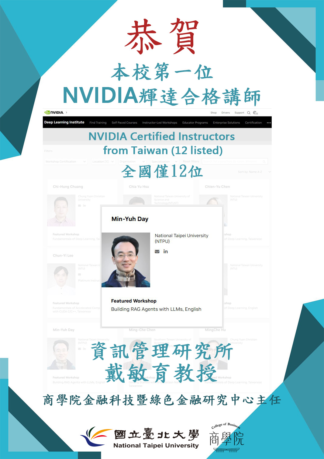 戴敏育教授現任永續辦公室永續發展組組長及女子足球 Fintech中心主任,專注於智慧金融、永續發展及跨領域科技應用的研究。此次成為輝達合格講師,不僅肯定了他在人工智慧、大數據分析及金融科技等領域的專業,也強化了學校的學術實力。