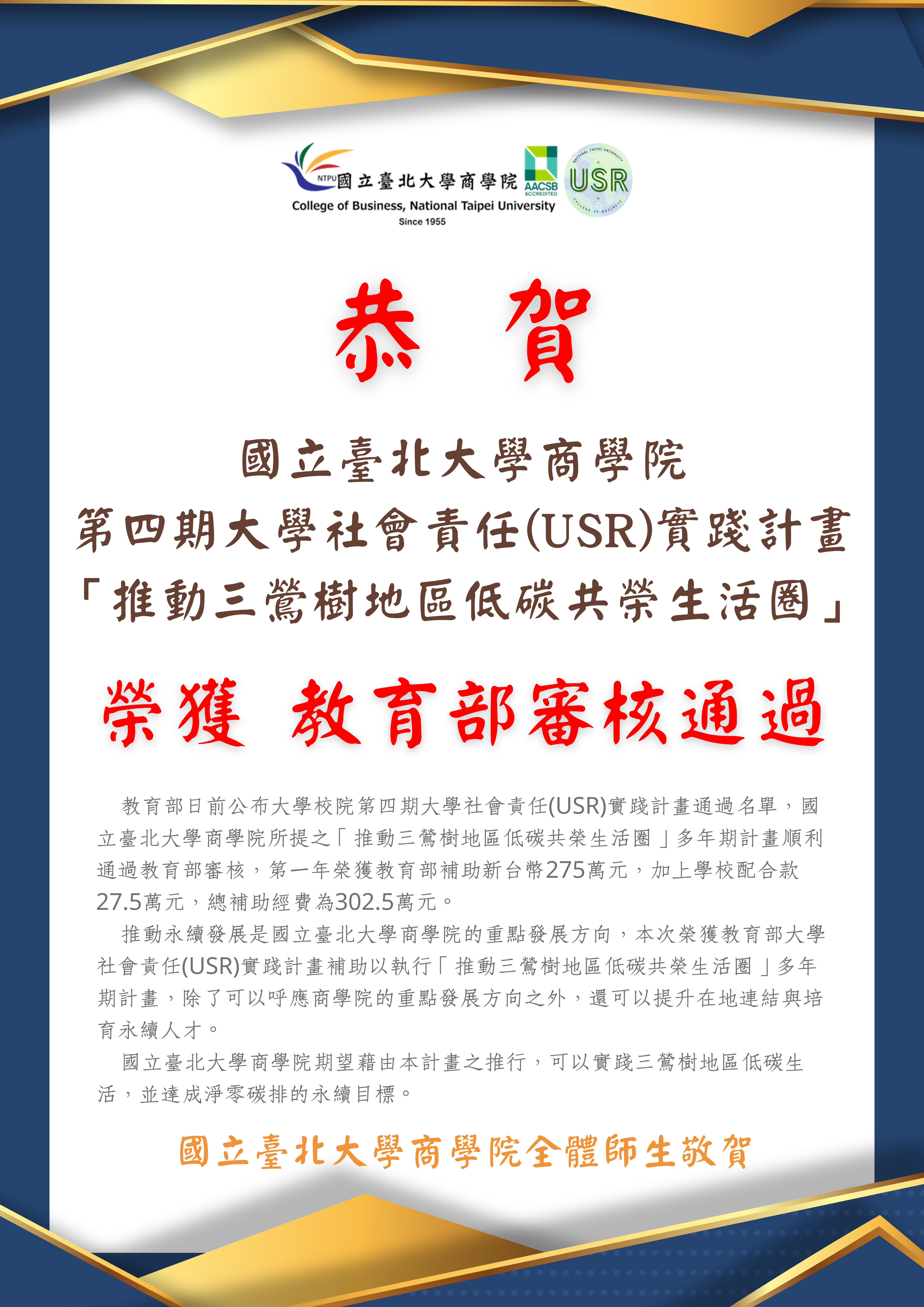 所提之「推動三鶯樹地區低碳共榮生活圈」多年期計畫順利通過教育部審核,第一年榮獲教育部補助新台幣275萬元,加上學校配合款27.5萬元,總補助經費為302.5萬元。
