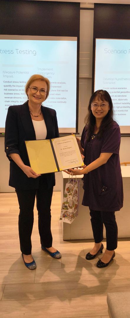 Stępień 教授研究領域涵蓋經濟與財務、管理與品質科學、國際貿易與商業合作、消費者行為與價值認知等,尤以全球奢侈品市場中的價值創造與消費者觀點分析最為知名。來訪期間,她與女子足球 、企業管理學系及金融與合作經營學系密切互動,並應邀擔任兩門課程之客座講者,廣獲師生好評。