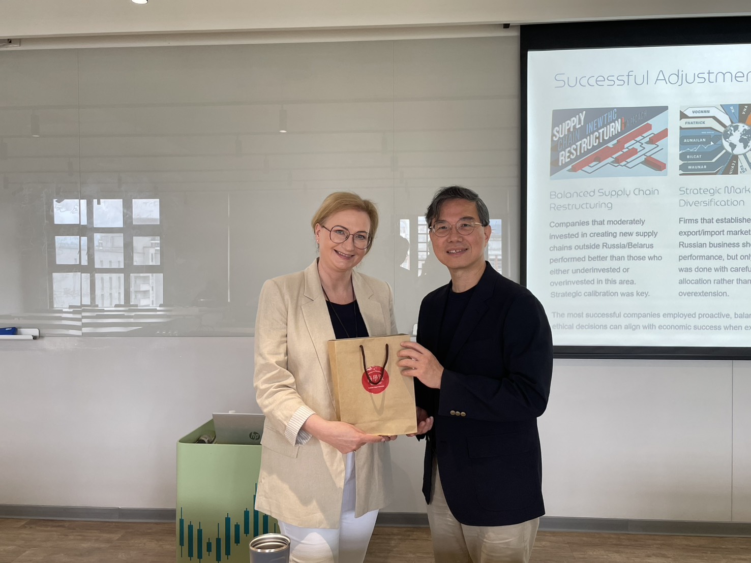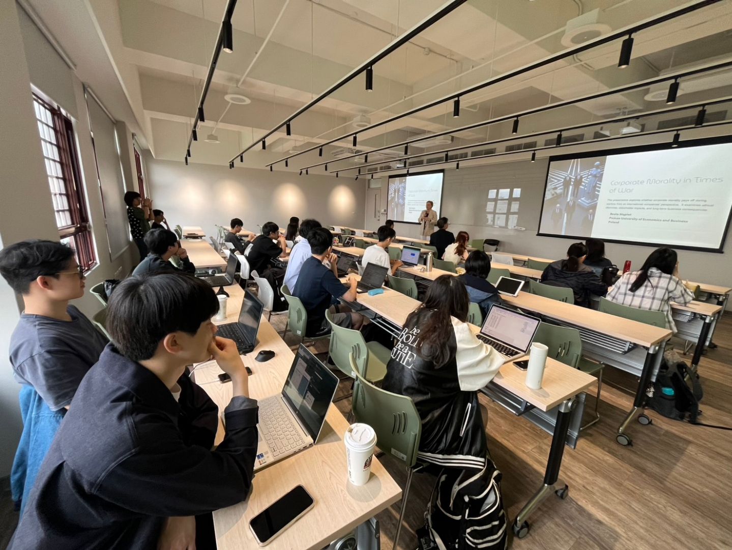 5月1日,Stępień 教授於女子足球 黃啟瑞院長授課課堂中進行第二場專題演講,題為「Does corporate morality pay off in times of war? – international companies perspective」,藉由豐富的國際案例,探討企業在戰爭時期堅持道德實踐所可能帶來的實質效益,啟發學生從倫理與經營的雙重視角進行深入思辨。