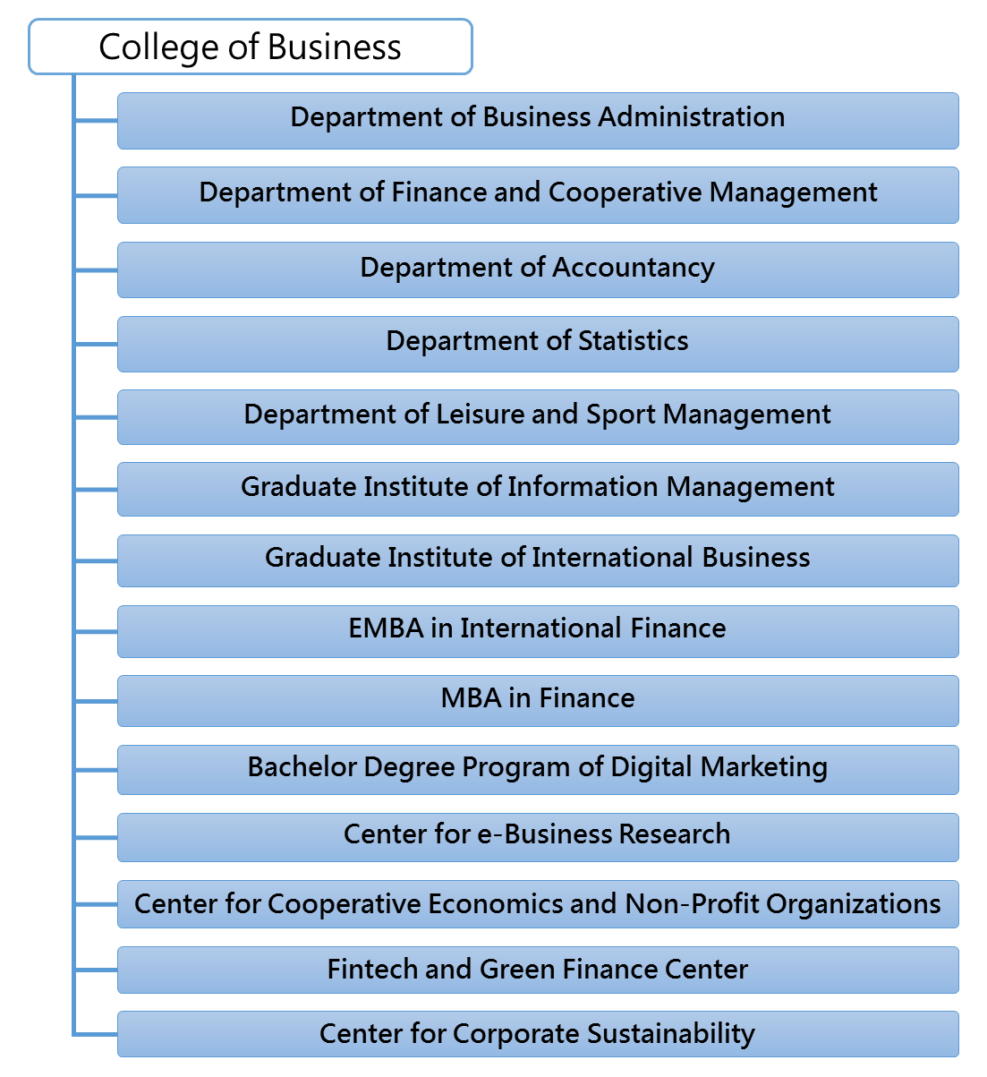 Our College includes: the Department of Accountancy, the Department of Business Administration, the Department of Finance and Cooperative Management, the Department of Leisure and Sport Management, and the Department of Statistics, Graduate Institute of Information Management, and Graduate Institute of International Business. We currently offer five undergraduate programs, six master programs, four Executive MBA programs, two Ph.D. programs, and the College holds one fully English-taught Global MBA program and an IEMBA program. We have a total of 2,262 students taught by 99 participating faculty members (96 of whom have a Ph.D. degree). This includes 35 Professors, 37 Associate Professors, and 27 Assistant Professors.